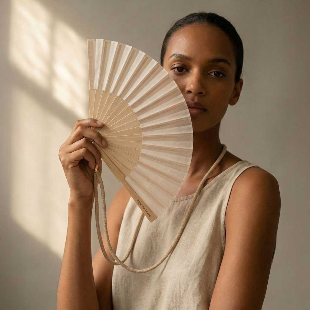 Su diseño ligero y clásico lo convierte en un complemento perfecto para los días más cálidos, aportando un toque natural y sofisticado. Incluye cordón para colgar, lo que facilita su transporte y uso durante el evento.