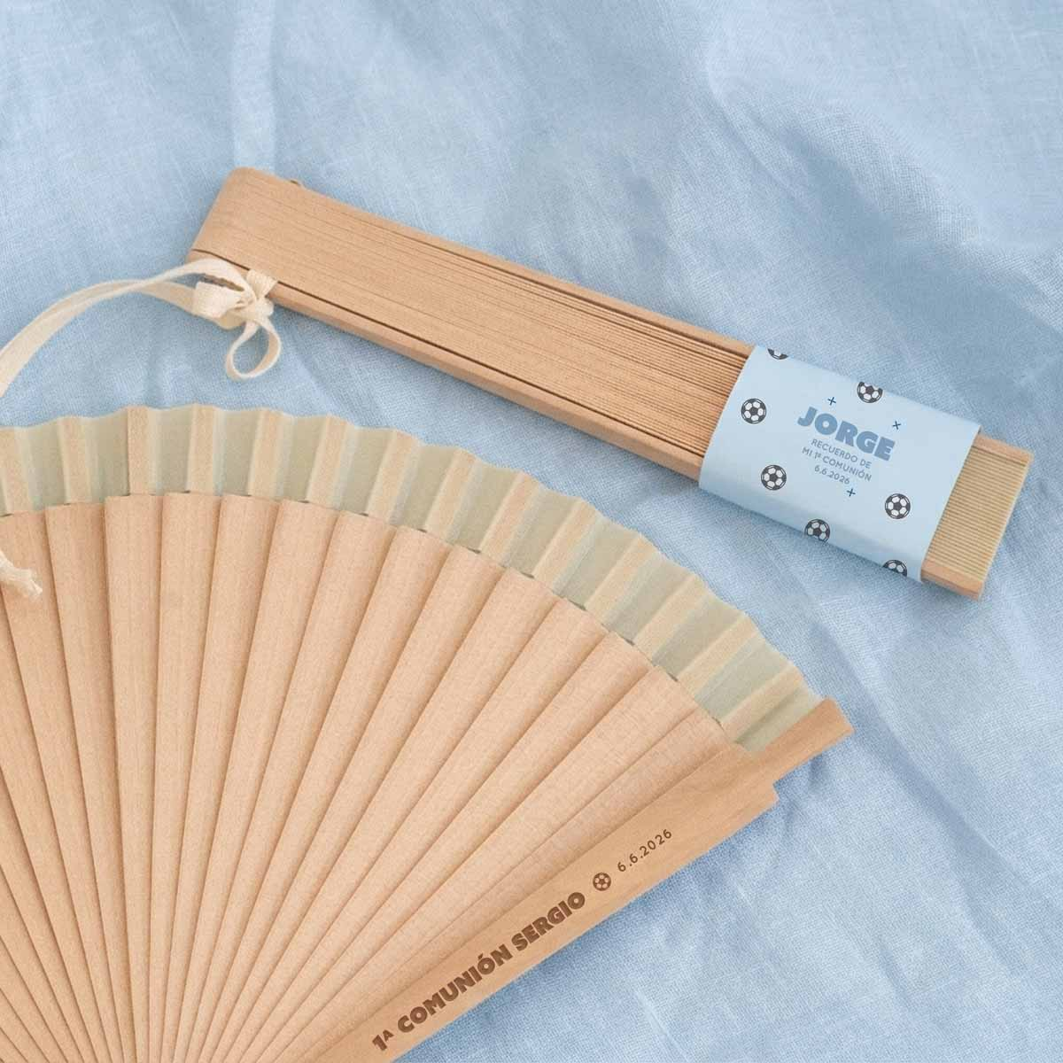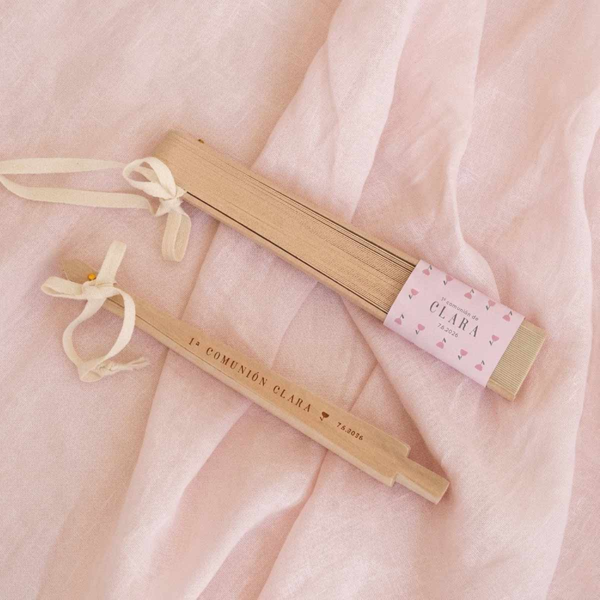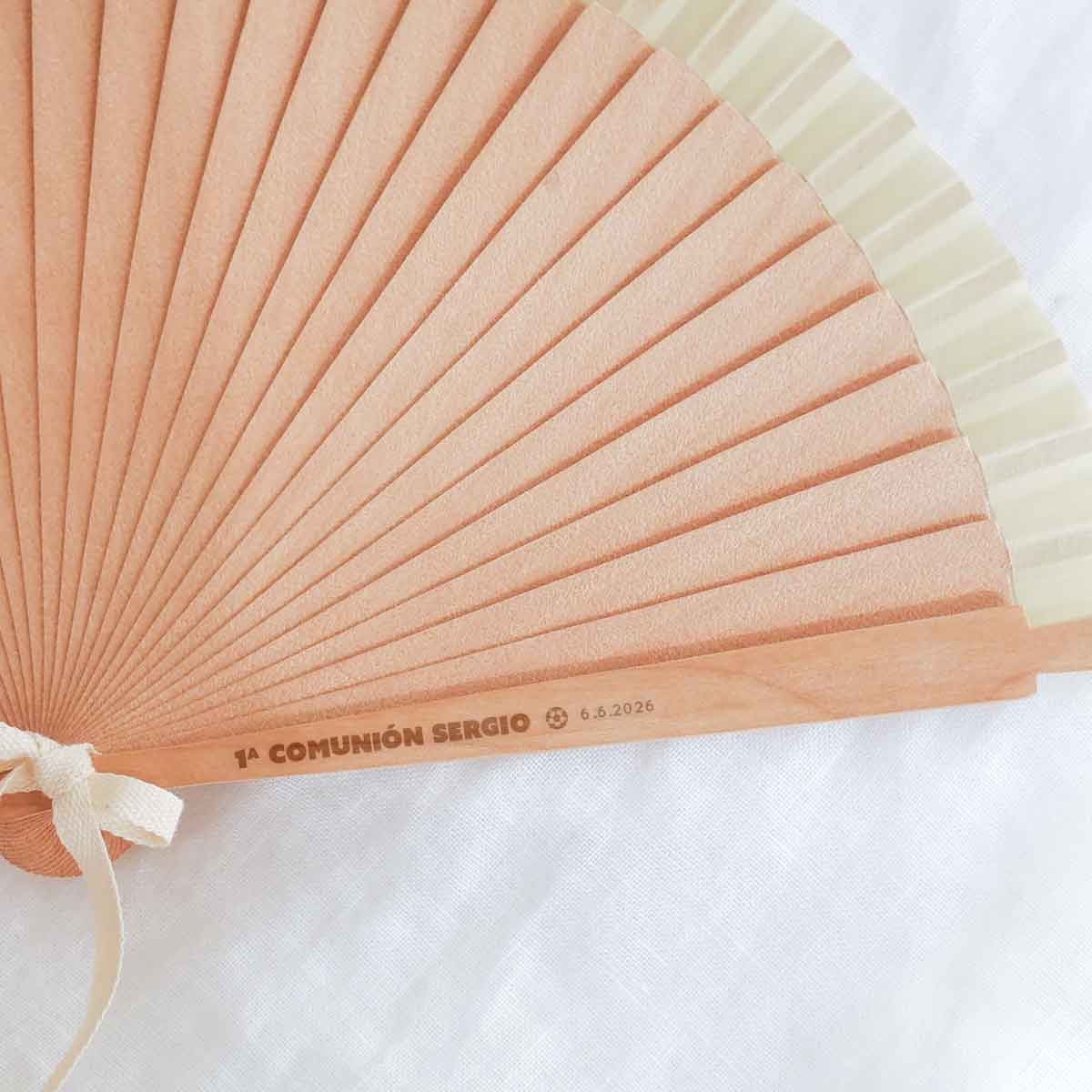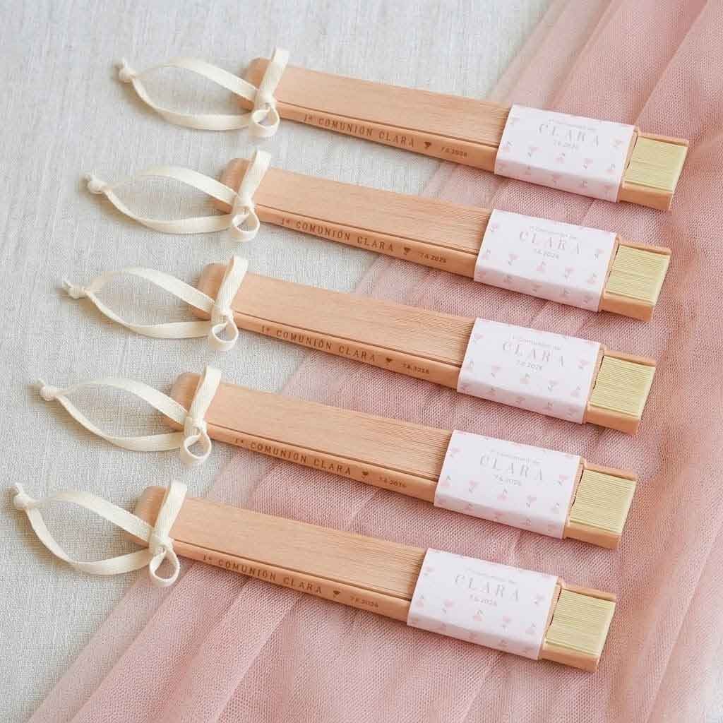 Un detalle elegante, útil y muy especial para regalar a los invitados de una comunión. Este abanico en color beige, fabricado en madera natural, es perfecto para los días más cálidos del evento, aportando frescura y un toque natural y sofisticado a la celebración. Su diseño ligero y clásico lo convierte en un recuerdo bonito y funcional que podrán seguir usando después del gran día. Incluye cordón para colgar, lo que facilita su uso y transporte durante la comunión.