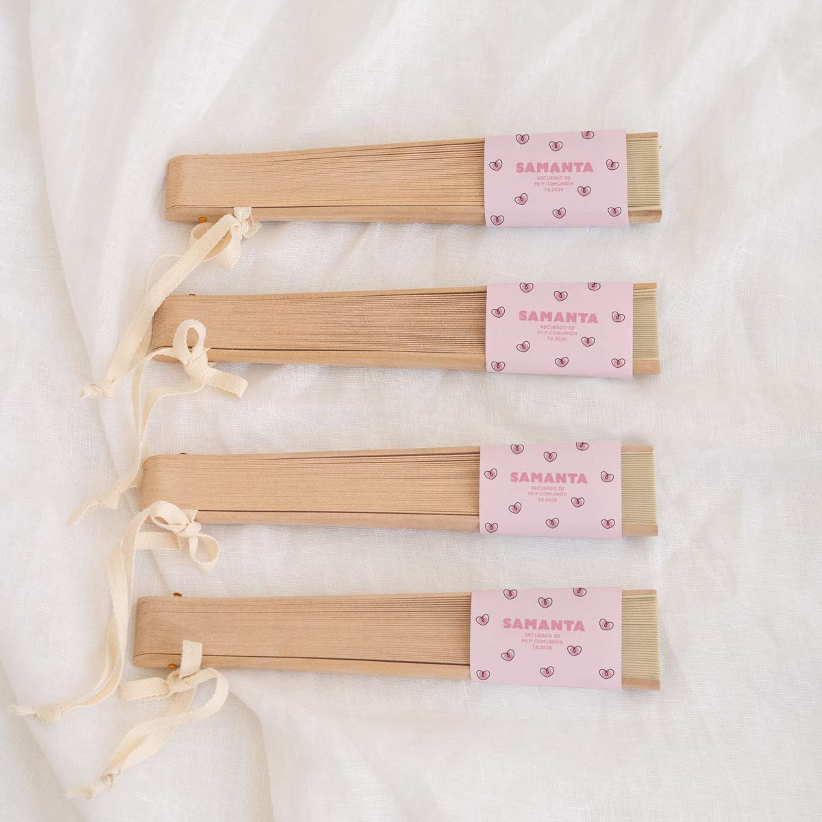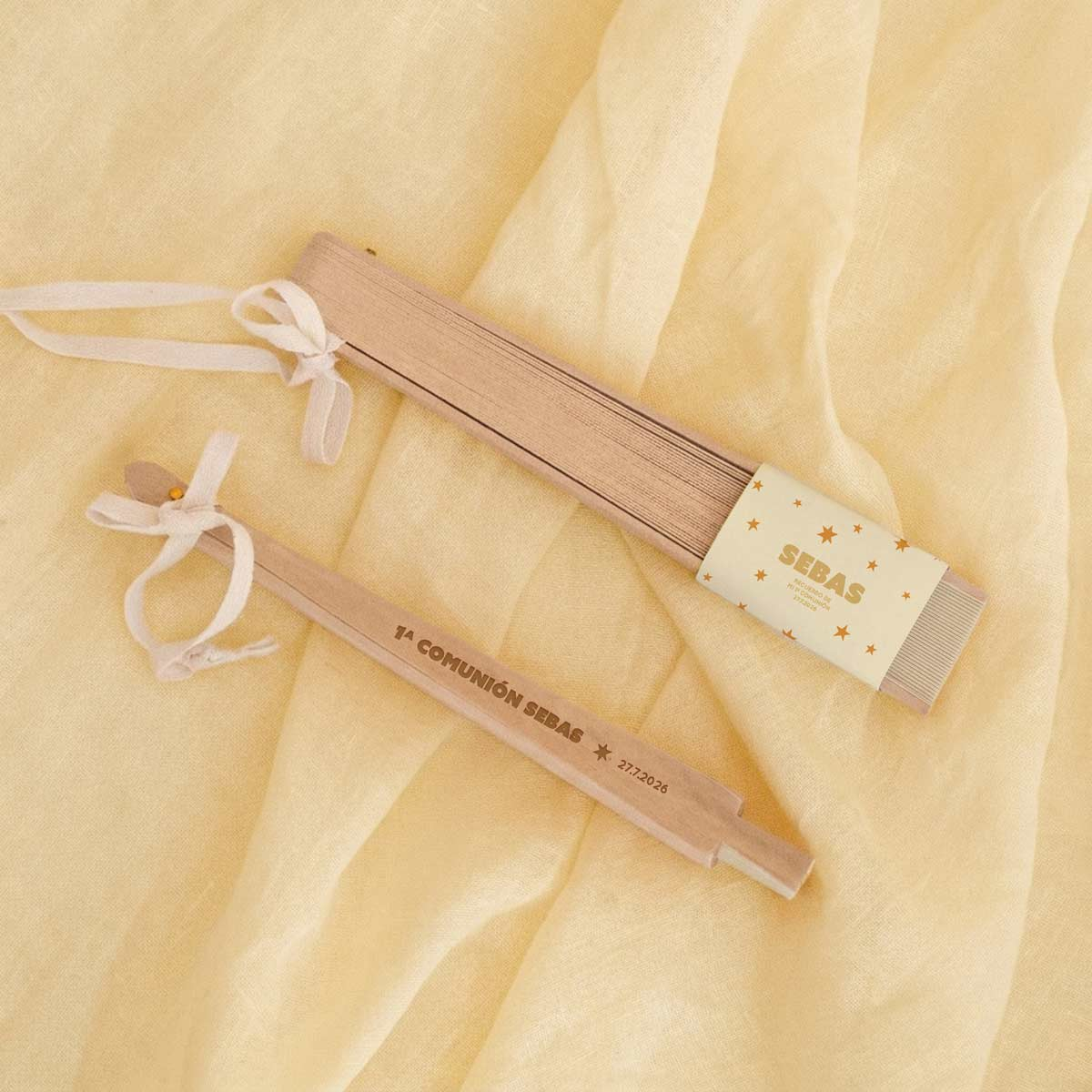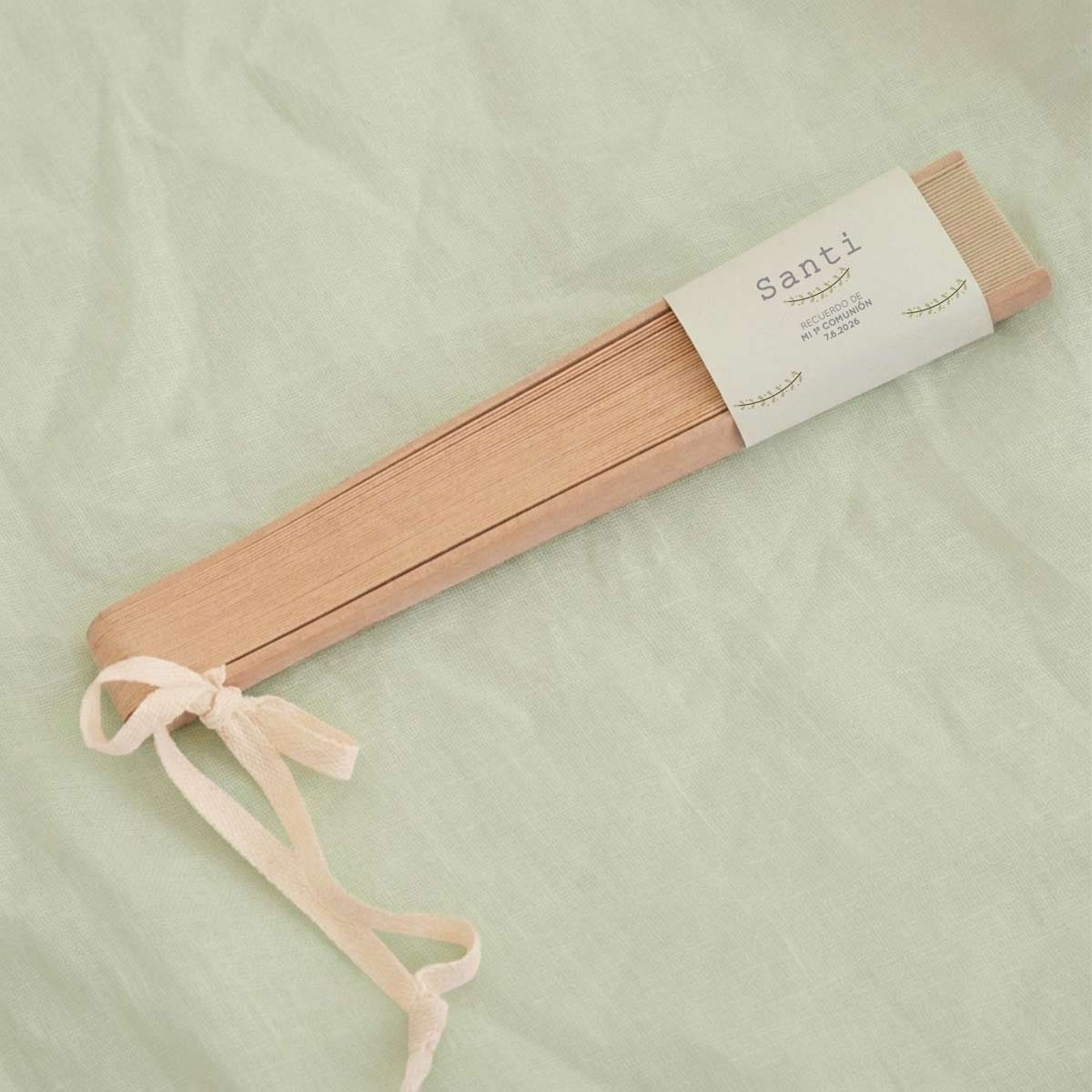 Un detalle elegante, útil y muy especial para regalar a los invitados de una comunión. Este abanico en color beige, fabricado en madera natural, es perfecto para los días más cálidos del evento, aportando frescura y un toque natural y sofisticado a la celebración. Su diseño ligero y clásico lo convierte en un recuerdo bonito y funcional que podrán seguir usando después del gran día. Incluye cordón para colgar, lo que facilita su uso y transporte durante la comunión.