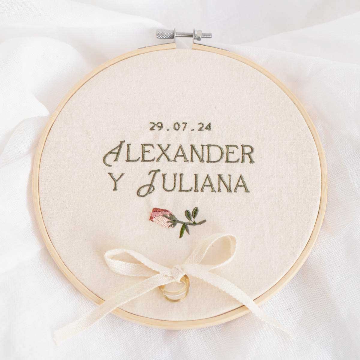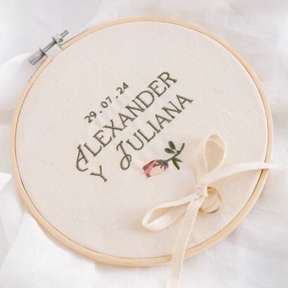 El Bastidor Bordado Flor es un detalle delicado y elegante para vuestra boda. Incluye un pimpollo de rosa y permite personalizarlo con los nombres de los novios y la fecha del enlace, convirtiéndolo en un recuerdo único del gran día.