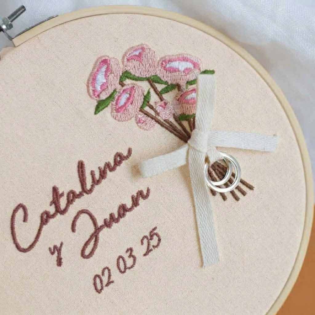 Bastidor de bambú bordado. El tejido es de color beige y el bordado está realizado en elegantes tonos rosa y terracota. El lazo del ramo cumple una función, no solo decorativa, sino también es útil para sujetar ahí los anillos.