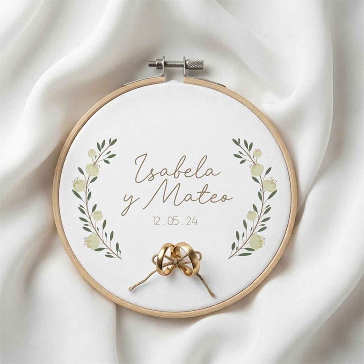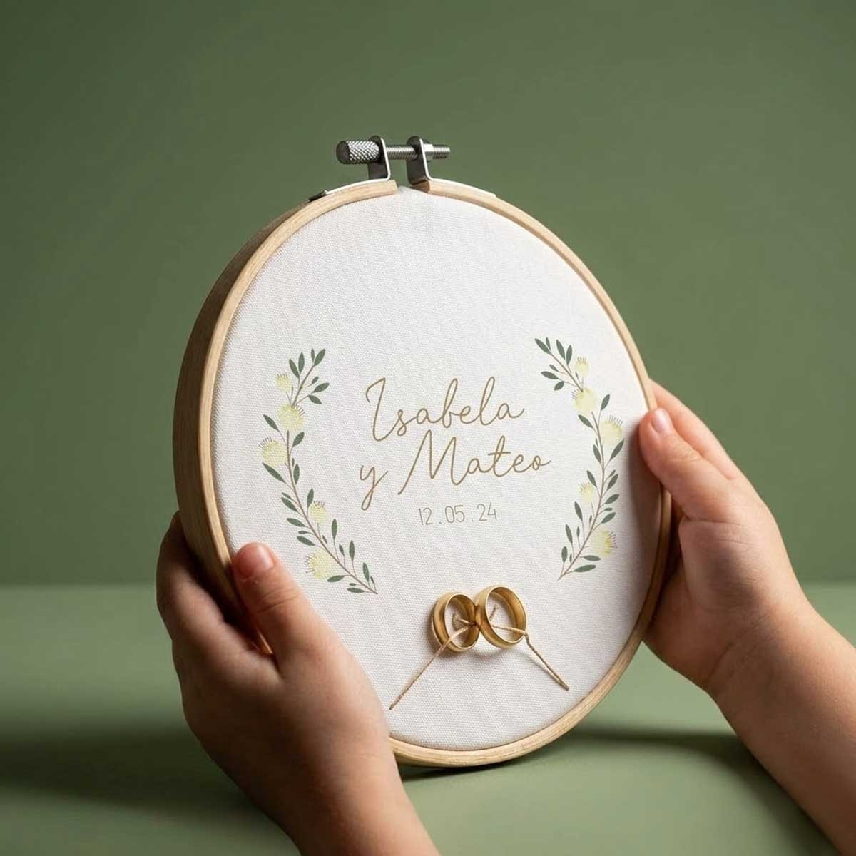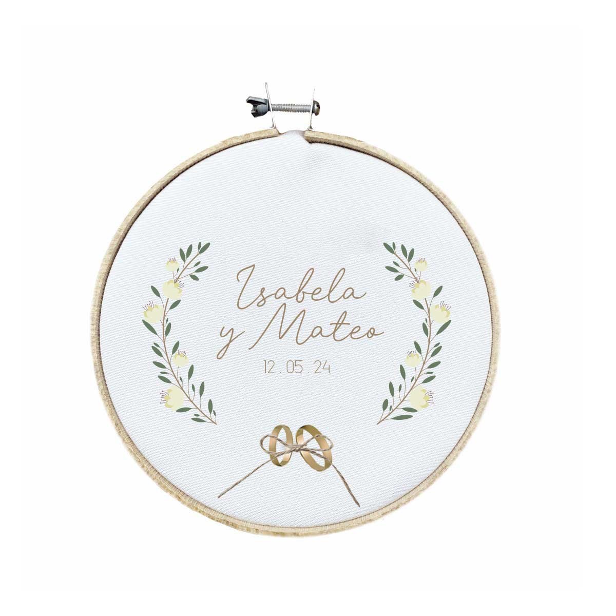 Impreso sobre bastidor de 19 cm con fondo blanco, este porta alianzas no solo sirve para el gran día, sino que también se convierte en un precioso recuerdo decorativo para conservar siempre. Se puede personalizar con los nombres de la pareja y la fecha del evento, haciendo de cada pieza un detalle único e inolvidable.