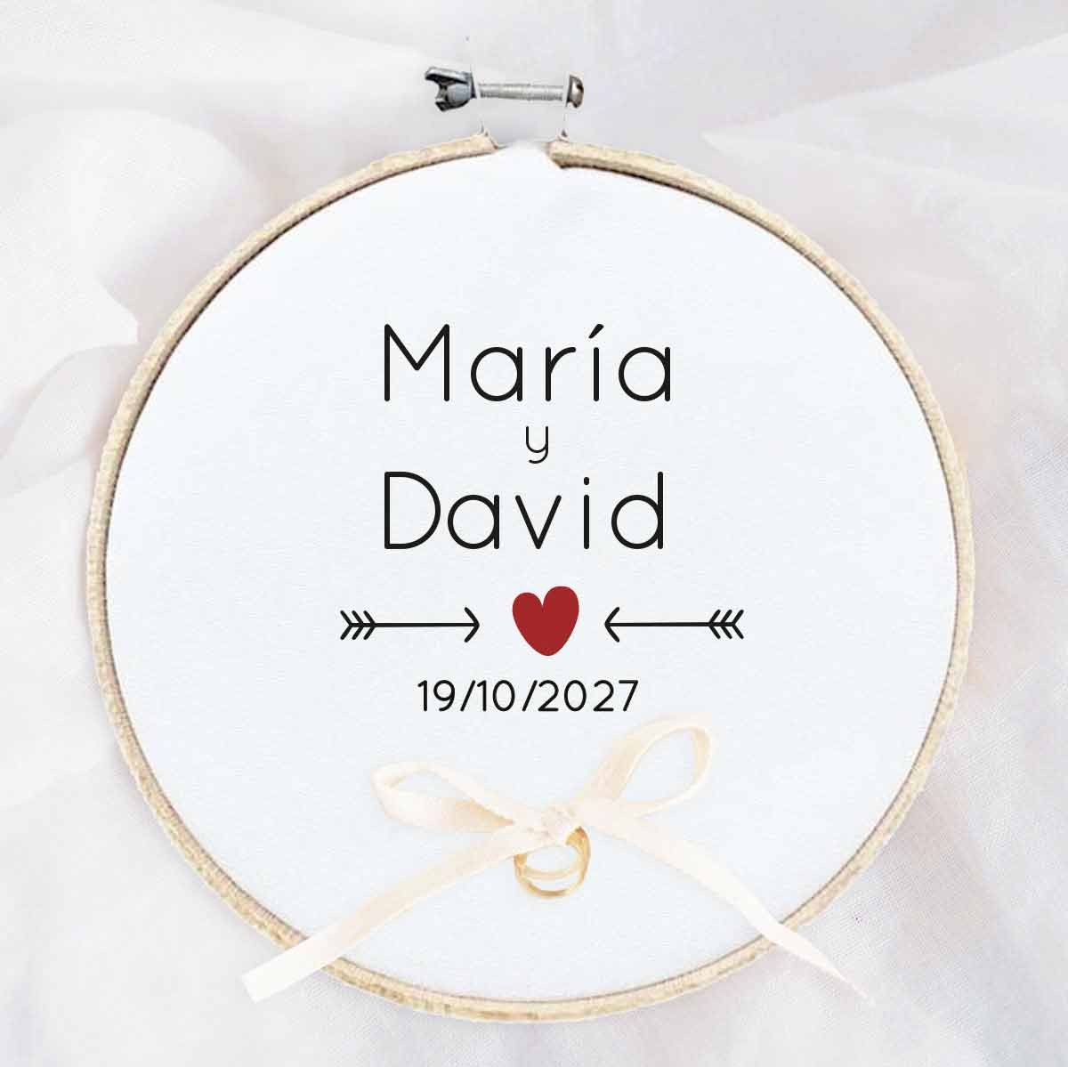 Este porta alianzas modelo corazón es moderno y actual, con una tipografía muy dulce, un pequeño corazón rojo y unas flechitas que simbolizan la unión. Se personaliza con el nombre de los novios y la fecha del enlace. Es de madera de haya, las letras están estampadas sobre tela blanca y los anillos se sujetan al bastidor con un fino cordel.