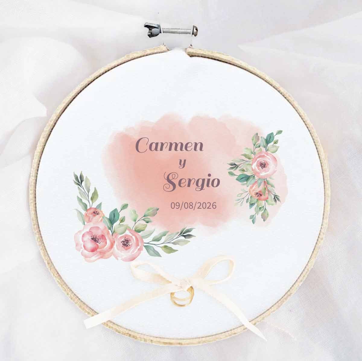 Si eres muy fan del estilo shabby chic y estás organizando tu boda, no puedes dejar pasar esta oportunidad. Este bastidor porta alianzas tiene un estilo muy dulce, romántico, vintage y femenino. Estampado sobre tela blanca en colores rosados pastel, está ornamentado con flores, los nombres y la fecha de la boda. Será sin duda un detalle de distinción en vuestra ceremonia.