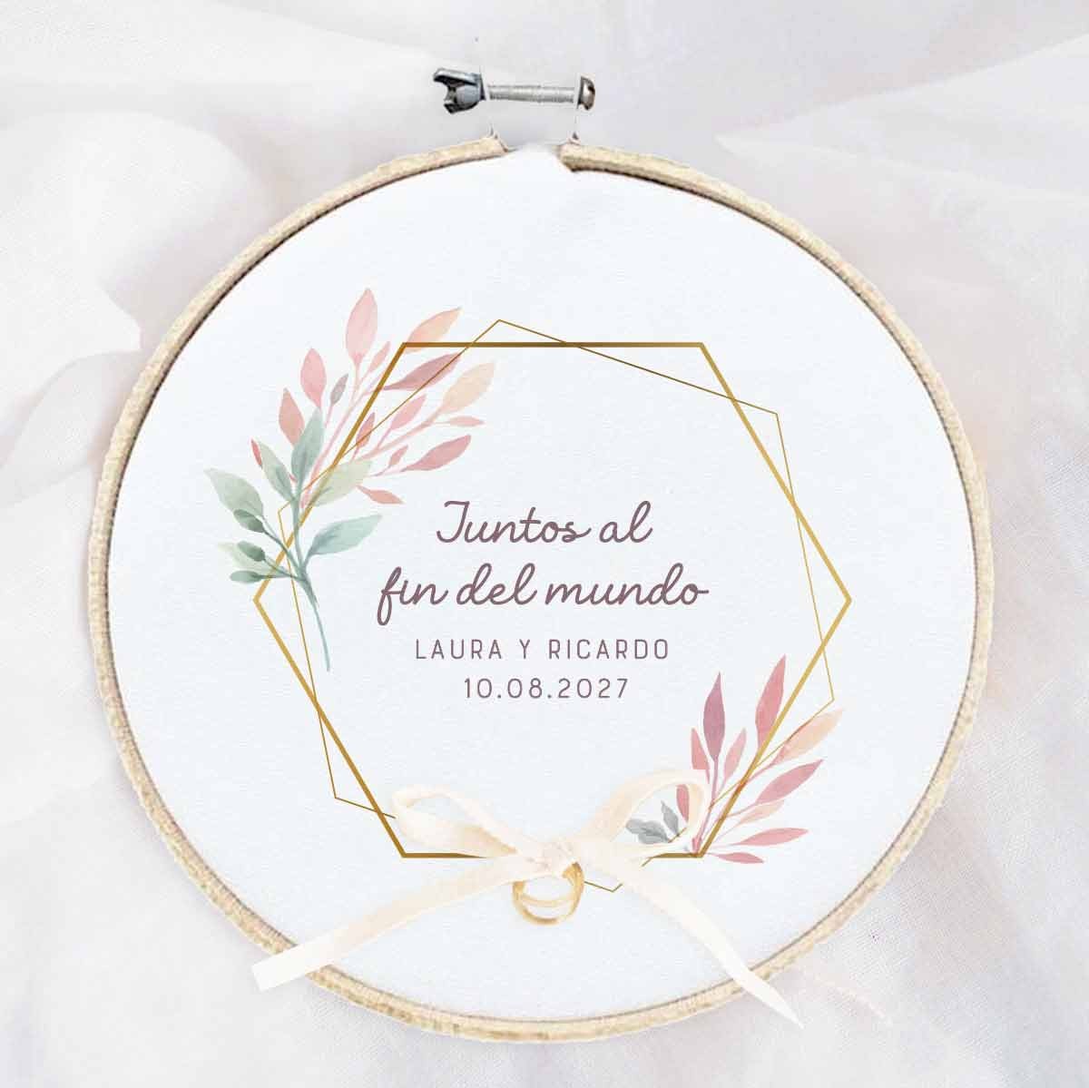 Este bastidor porta alianzas es de madera, está estampado sobre tela blanca, con un diseño muy actual, moderno y elegante. Tiene dos hexágonos entrelazados y dos ramitas de hojas en tonos pastel que le dan un toque muy chic. Lo puedes personalizar con los nombres, la frase que quieras y la fecha del enlace. Los anillos van sujetos con un cordel muy fino.