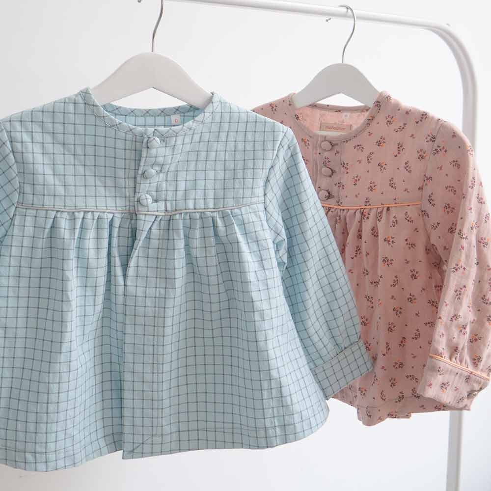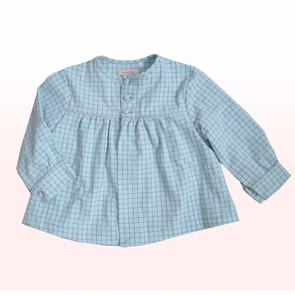 ¡El primer look fallero de tu peque con mucho estilo! Este blusón en tonos azul claro con cuadros grises es perfecto para vestir al bebé con ternura y comodidad durante las Fallas. Su diseño clásico y dulce lo convierte en un conjunto encantador para lucir estas Fallas.