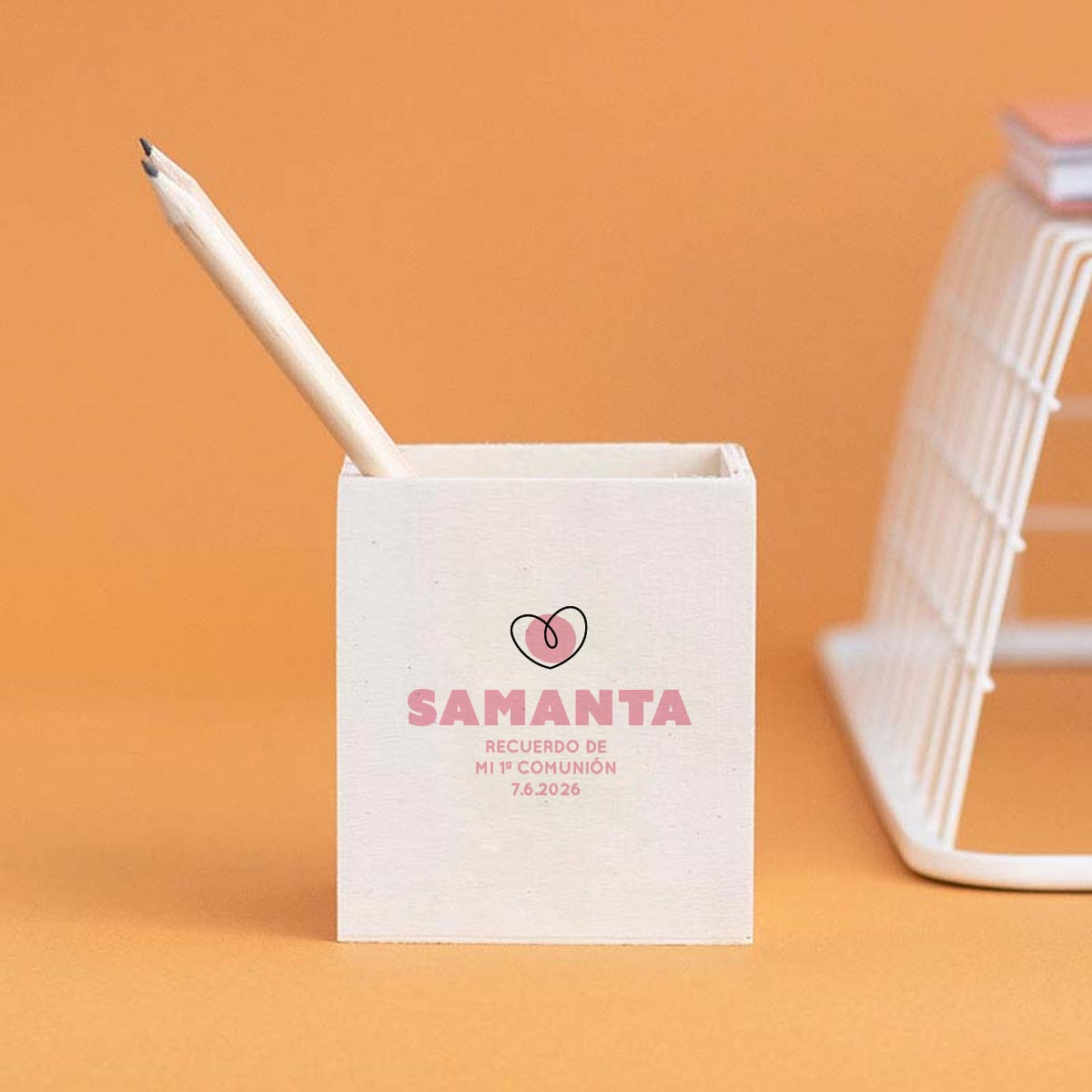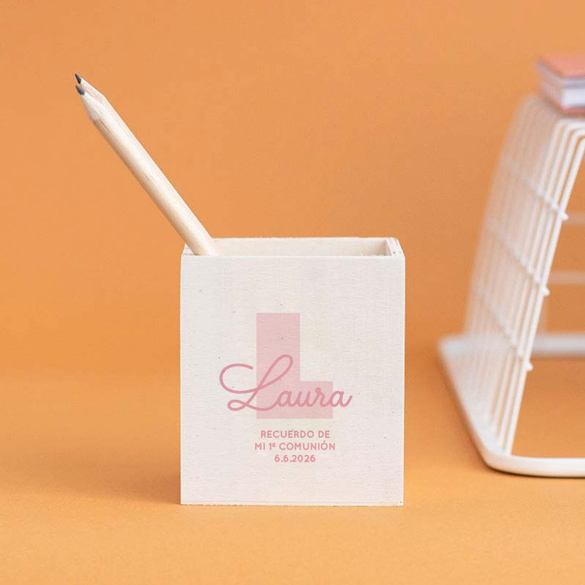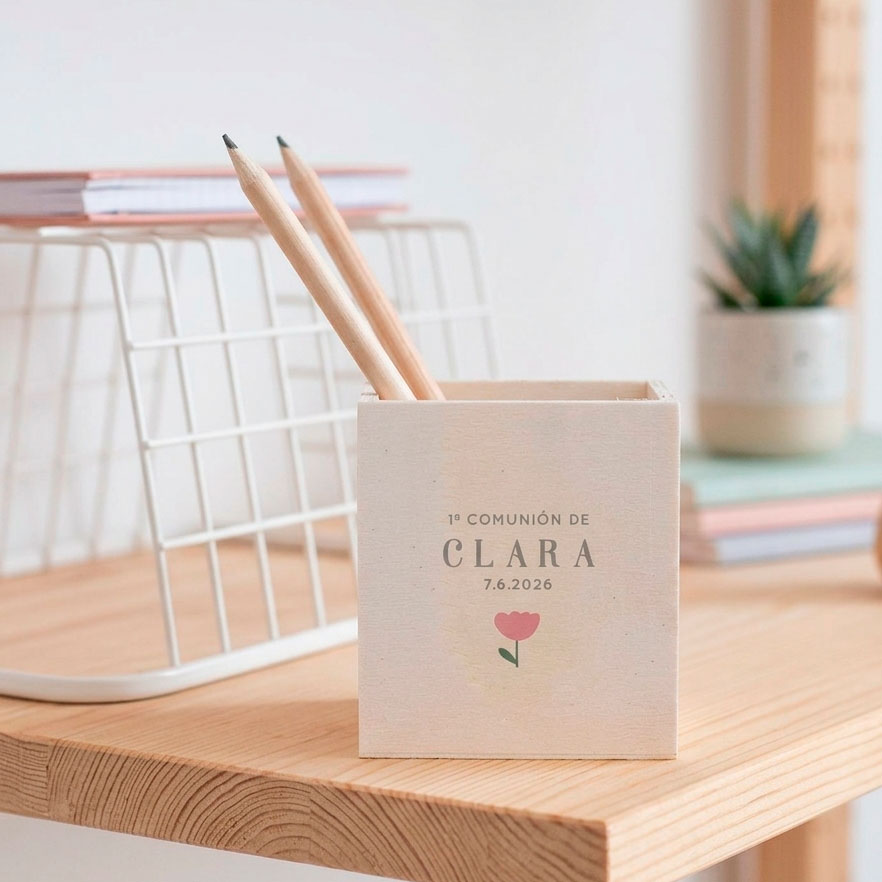 Un regalo divertido y práctico para los niños invitados. Este bote de madera ayuda a mantener ordenados lápices, bolis y rotuladores, y se personaliza con el nombre de cada niño y el diseño que elijas.