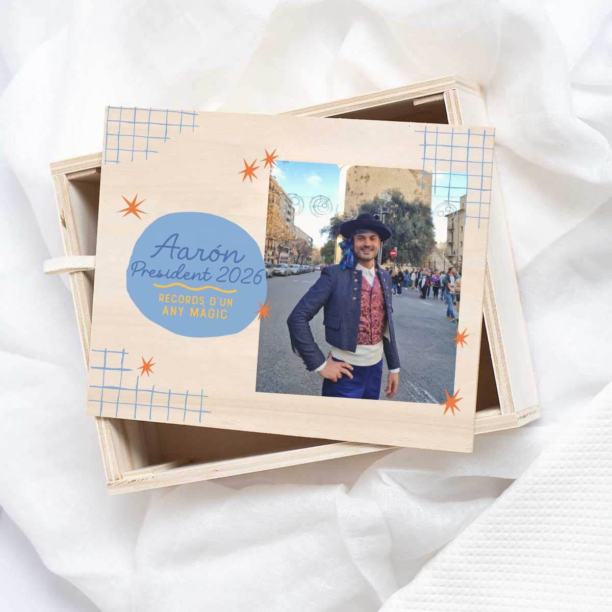 Un recuerdo único para un año inolvidable. Esta caja de madera de haya natural se personaliza con la foto de la FM, FMI o Presi infantil, su nombre, cargo y año. Ideal para guardar la banda, insignias, fotos y detalles del año fallero.