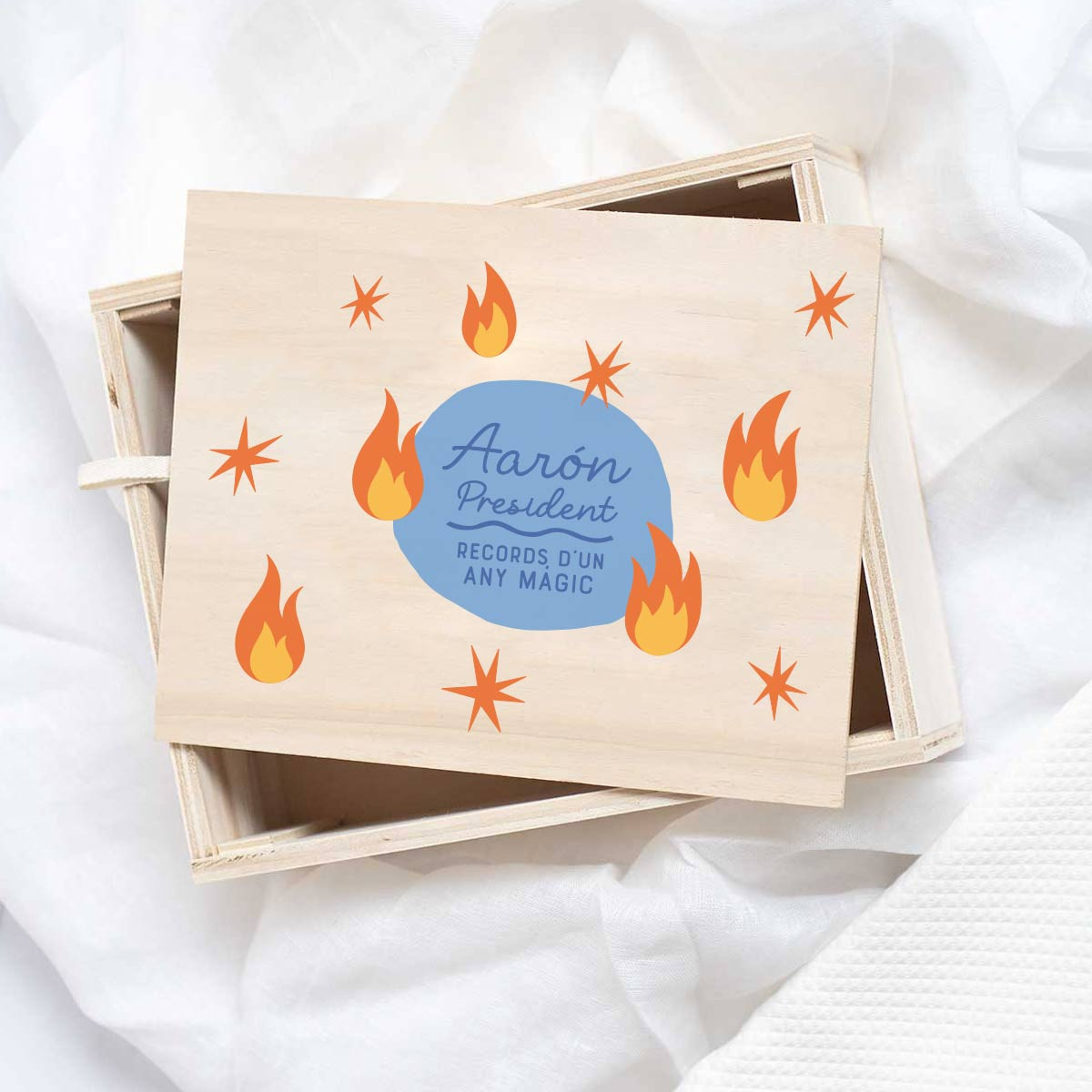Fabricada en madera de haya natural y decorada con un alegre estampado fallero incluye la frase "Rècords d’un any màgic" y se personaliza con el nombre, el cargo y el año. ¡Ideal para guardar la banda, pins, fotos, cartas... y hasta el confeti del último pasacalles!