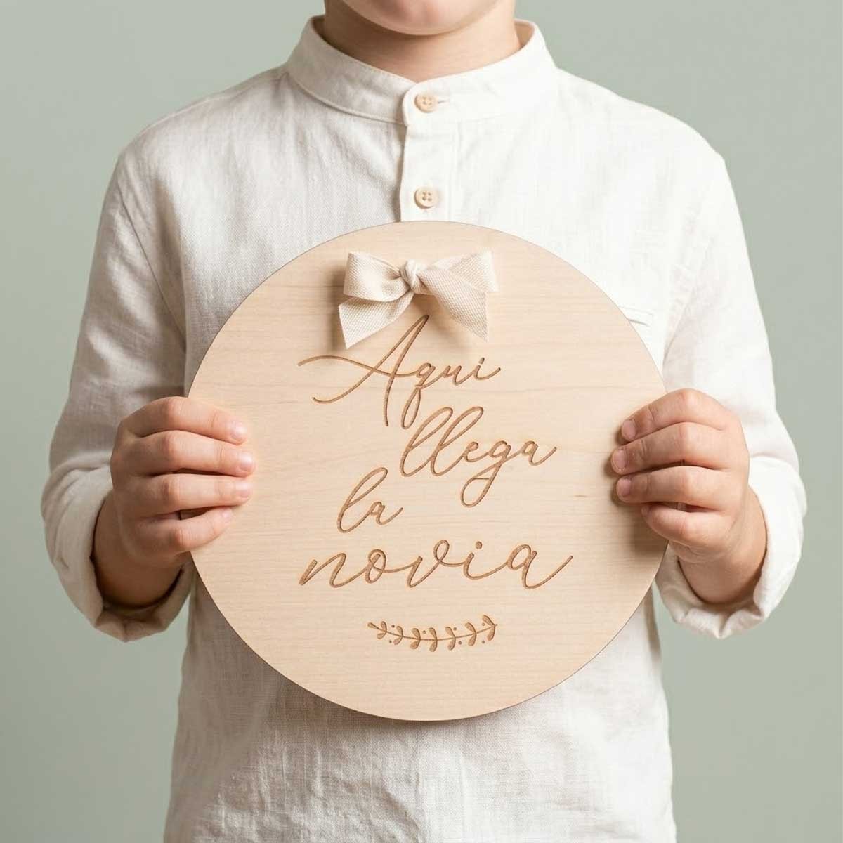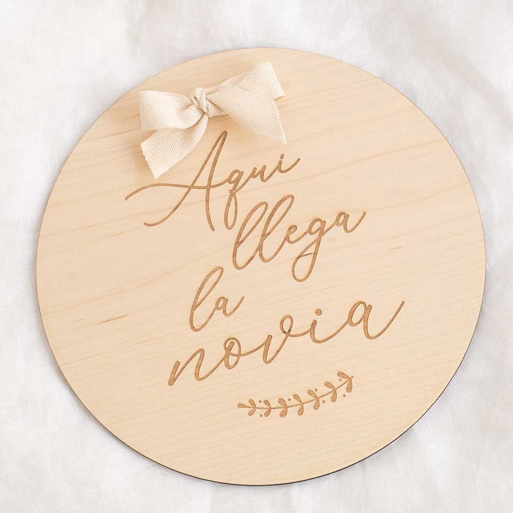 Está fabricado en madera de abedul y grabado a láser con el mensaje “Aquí llega la novia”, lo que le aporta un acabado elegante, natural y muy duradero 🌿