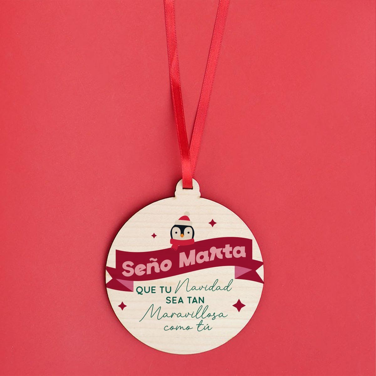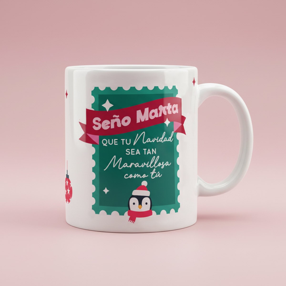 Tienes la opción de personalizar el pack con el nombre del profesor o profesora, que iría en la taza, la tapa de la vela y la bola navideña, así como el mensaje de la parte de detrás de la taza. También puedes cambiar la palabra profe por Seño o maestra/o. En la versión sin personalizar siempre irá "PROFE".