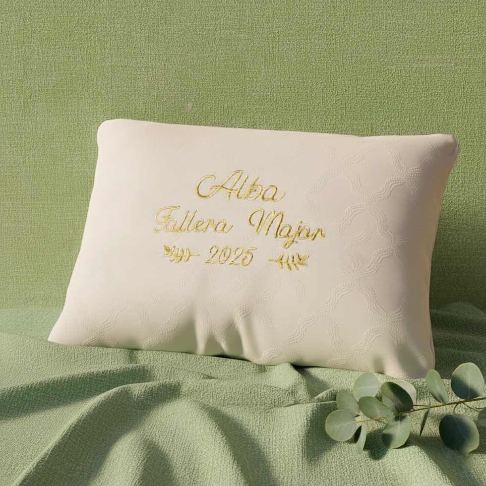 Cojín para llevar la banda de Fallera Mayor bordado en hilo de plata con el nombre, cargo y año. Un regalo súper especial que luego se quedará de recuerdo.
