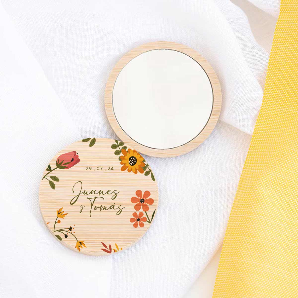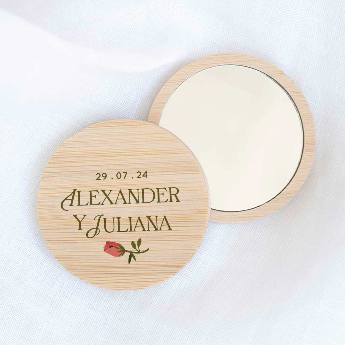 Espejo de madera de bambú personalizado para regalar a los invitados de la boda. Con el mensaje que más te guste, se puede personalizar con el nombre de los novios y la fecha de la boda para que sea un recuerdo único y muy especial. Además, es un regalo de boda muy útil.