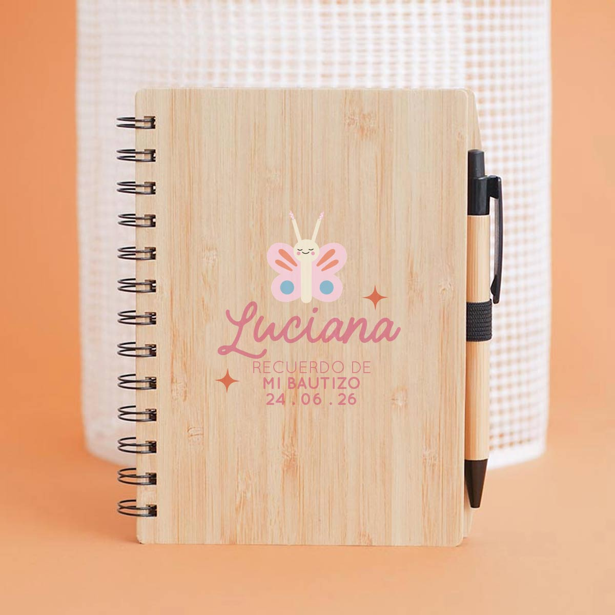 Esta libreta de madera con tapas de bambú es un recuerdo de bautizo bonito, útil y lleno de significado. En su interior encontrarás 70 hojas lisas de papel kraft, perfectas para escribir, dibujar o guardar mensajes especiales, e incluye un bolígrafo a juego.