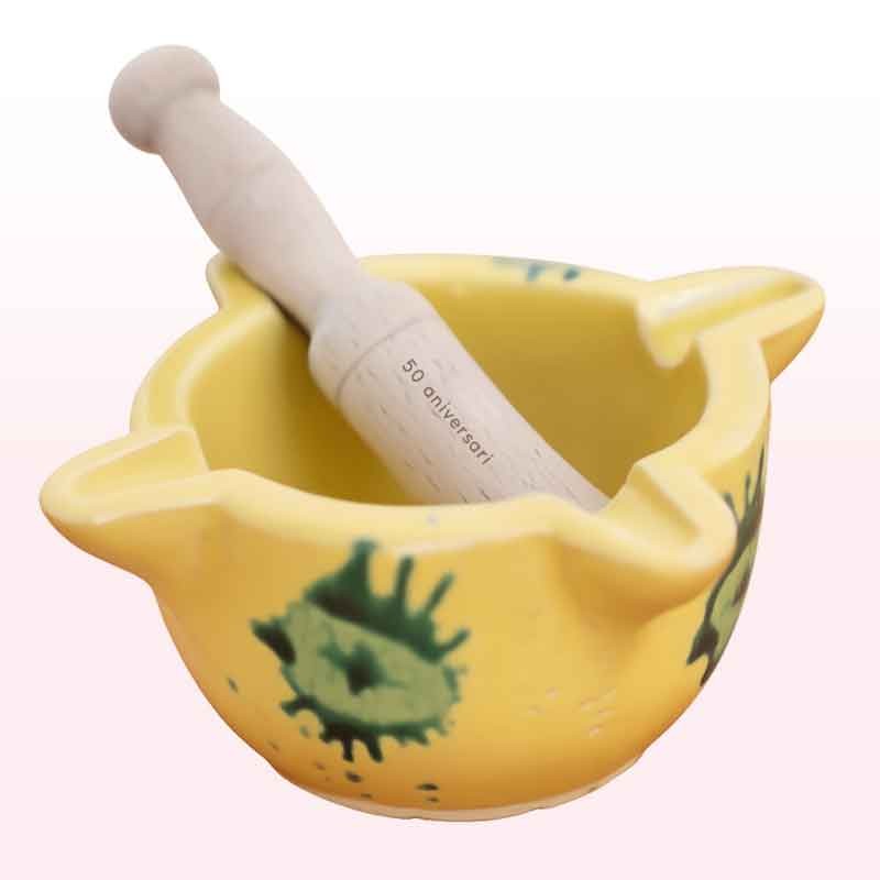 Mortero tradicional de cerámica resistente, en colores amarillo y verde, perfecto moler hierbas o especias, para picadas o alioli. Esmaltado sin plomo, seguro y duradero.