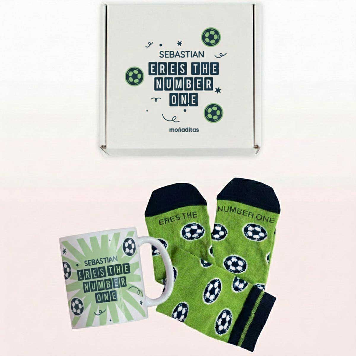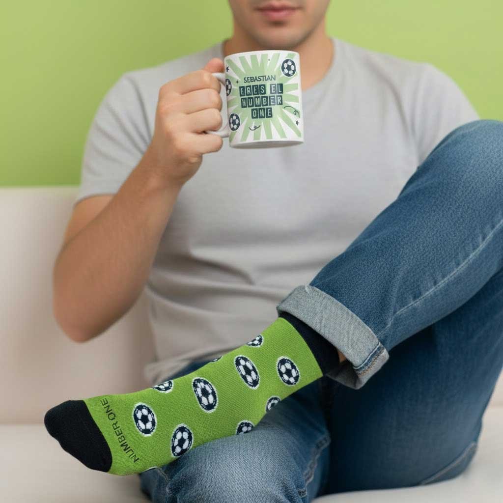 La taza se personaliza con el nombre, convirtiéndola en una pieza única para disfrutar del café o del desayuno antes del partido. Los calcetines con temática futbolera completan este pack pensado para sumar comodidad, estilo y espíritu deportivo.