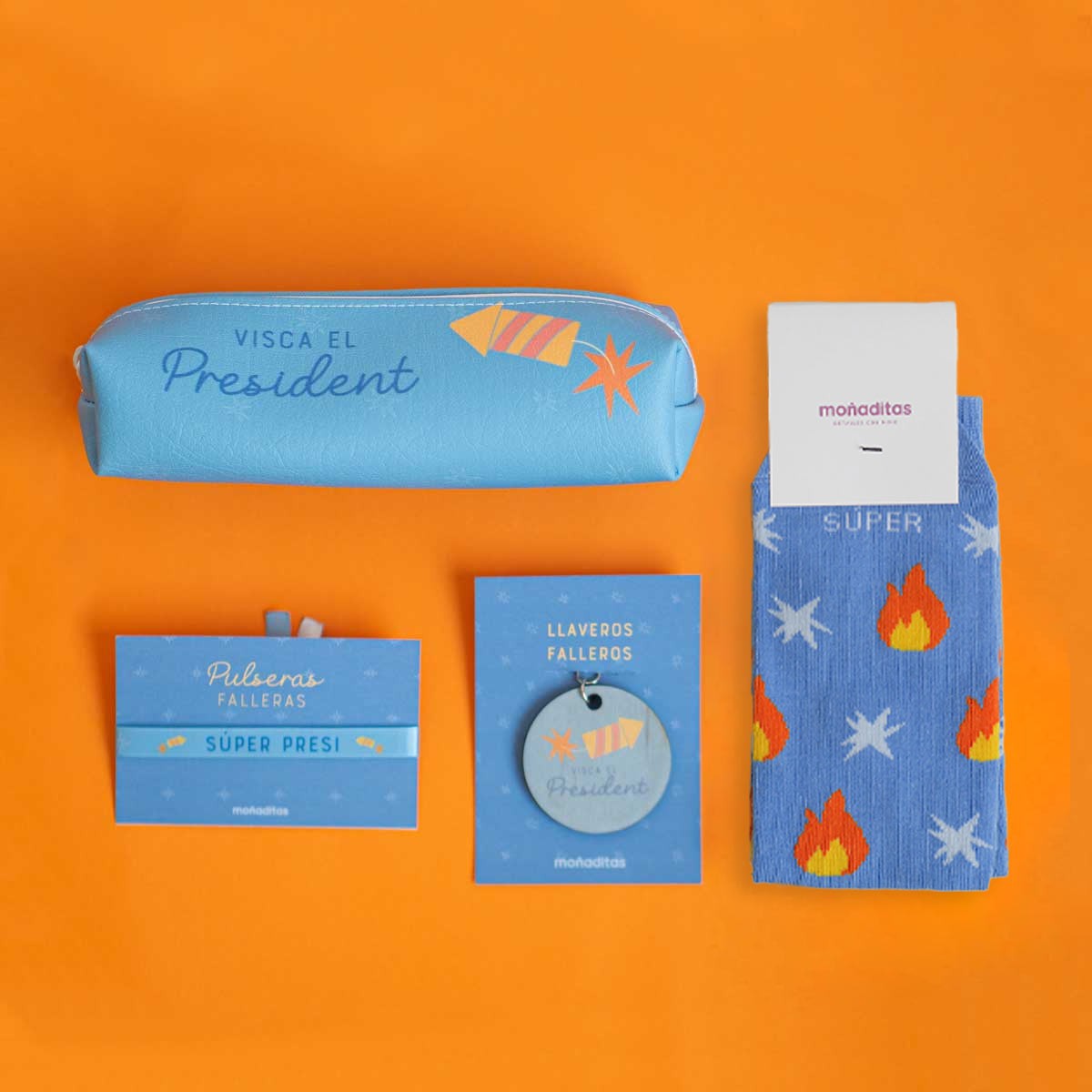 Este pack de regalo para Presidente es una idea genial. Con mensaje "Visca el President Infantil", el pack contiene pulsera, calcetines de súper presi, un llavero y un estuche. Todo empaquetado bien bonito en una cajita en la que se le puede poner una dedicatoria con el nombre de la persona que hace el regalo.