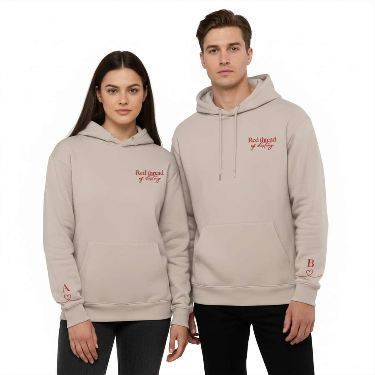 El Pack Sudaderas “Hilo Rojo” es un regalo perfecto para parejas que creen en el destino. Ambas sudaderas son idénticas, con el mensaje bordado “Red Thread of Destiny” en rojo y un pequeño corazón con hilo bordado que conecta las iniciales personalizadas de cada uno en la manga.
