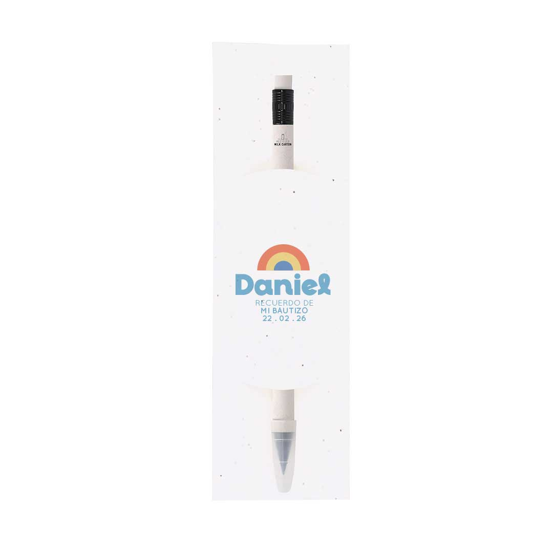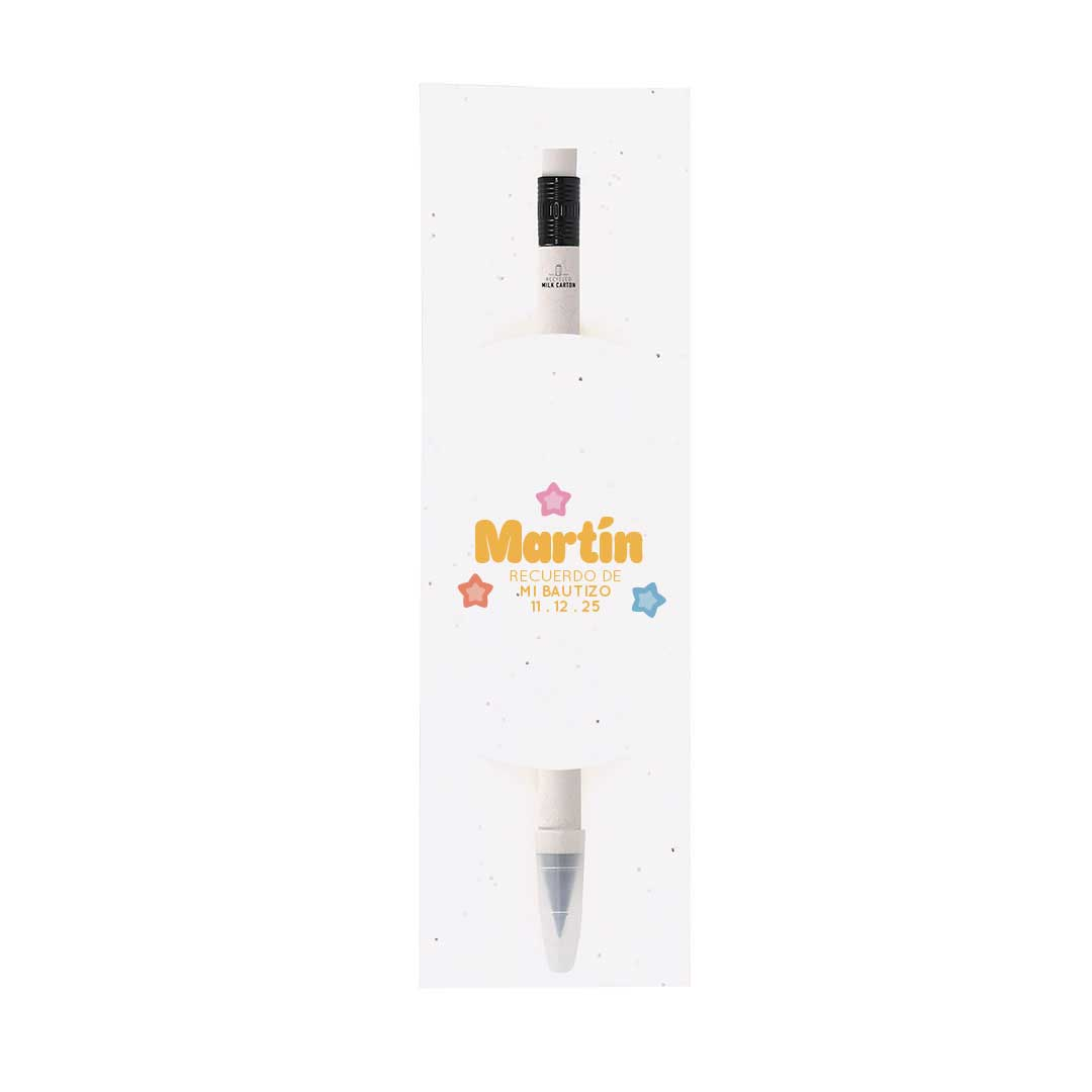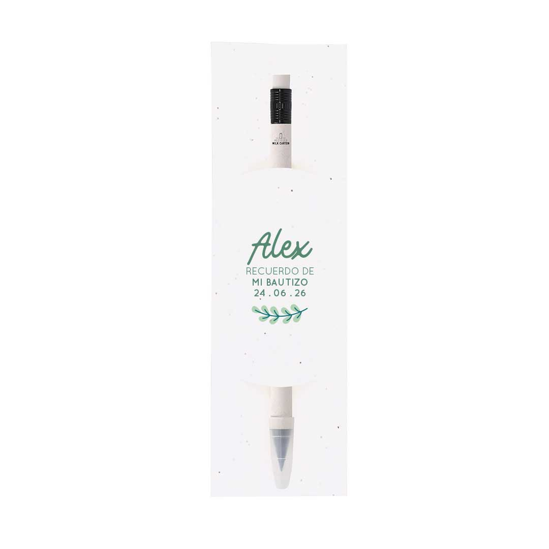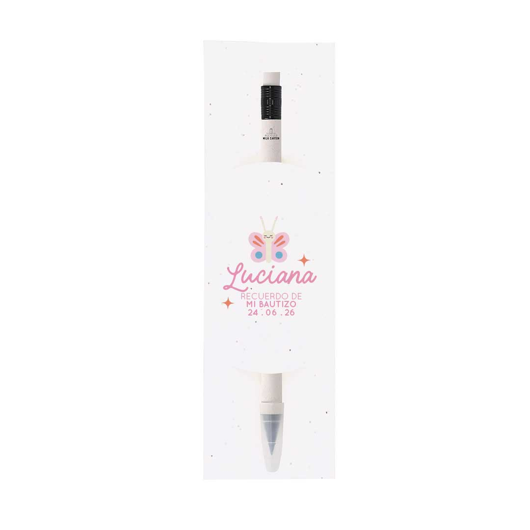 Un detalle único y ecológico para regalar en el bautizo 🌸 Este lápiz eterno, fabricado con cartones de leche reciclados, es reutilizable, práctico y adorable. Viene en funda plantable con semillas de petunia, ¡para que tus invitados puedan sembrarlo y ver crecer su flor!