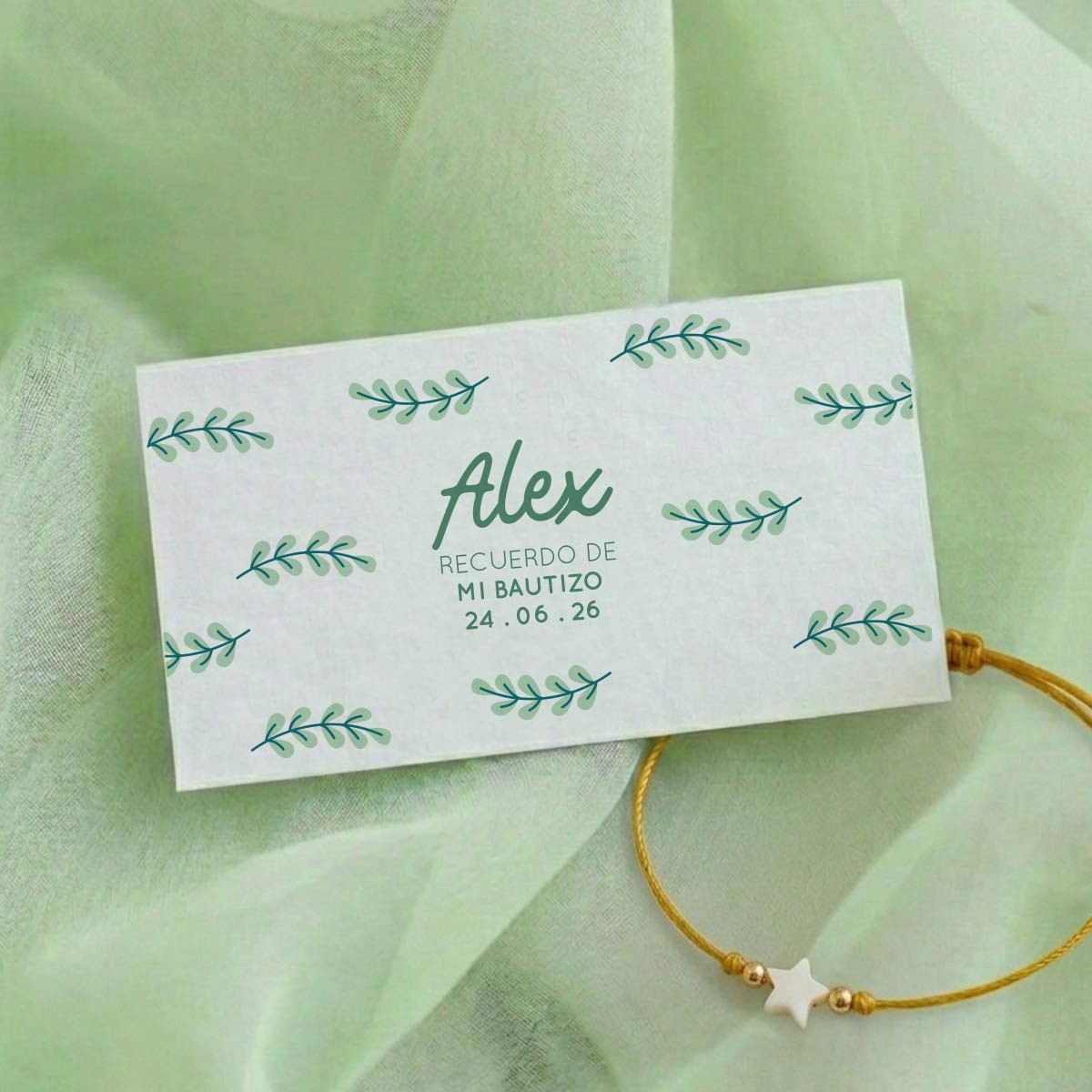 Diseñada con un estilo sencillo y elegante, combina un cordón ajustable en color ocre con un charm de estrella que simboliza luz, cariño y buenos deseos. Además, incluye packaging personalizado que completa el detalle con un acabado cuidado y especial.