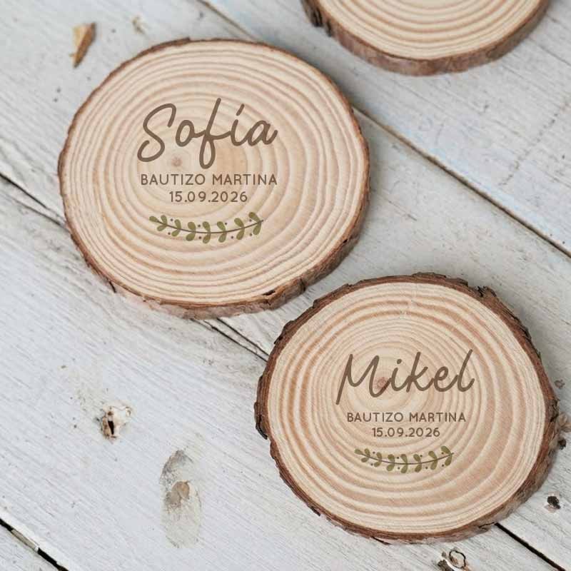 Rodajas de madera para utilizar como marcasitios en un evento especial. Cada uno va personalizado con el nombre del invitado y una línea adicional donde se puede poner la fecha del evento y el recordatorio.