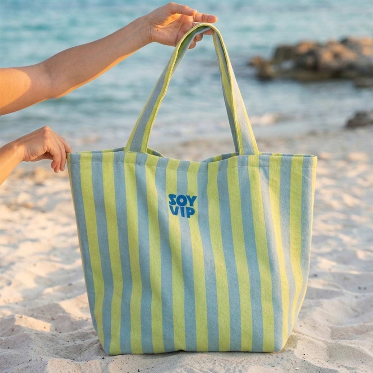 Bolso de loneta a rayas azules y verdes, material 100% poliester y mensaje bordado